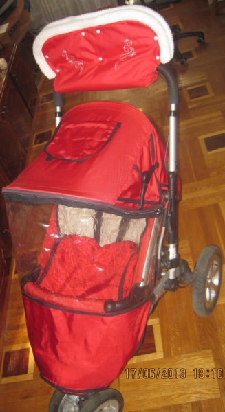 Диаметр передних колёс — 25 см, задних — 28 см. В подарок — меховая муфточка для сохранения тепла маминых ручек в период зимних прогулок.