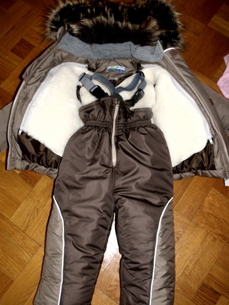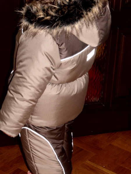 Полукомбинезон -, верх — мягенькая плащевка, низ- подкладка нейлон, брители регулируються на несколько (см) регуляторами,, внизу на штанишках стоят защиткиот грязи, предусмотрены подвороты.