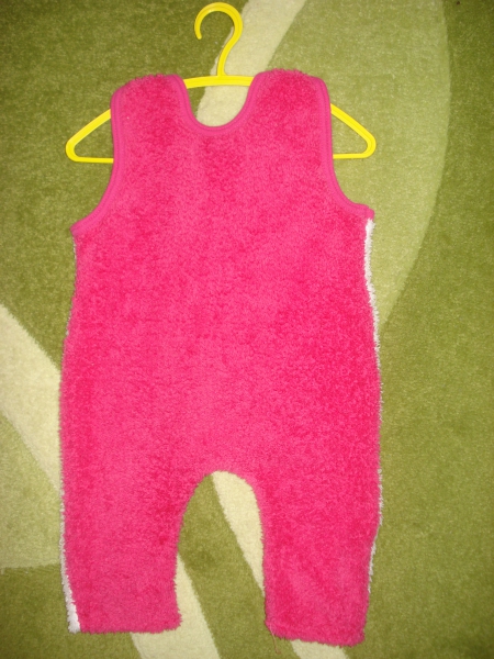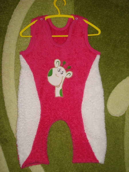 Комбинезон с веселой вышивкой — жирафом. Сверху застегивается на две кнопочки. Ножки открыты.