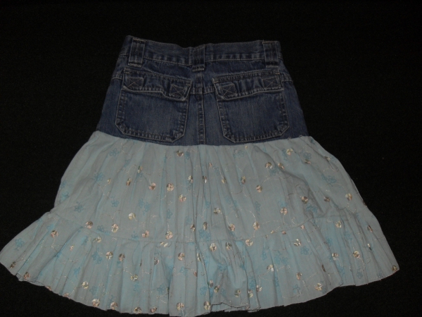 Джинсовая юбка с голубой рюшью: пояс 56см; длина 42см