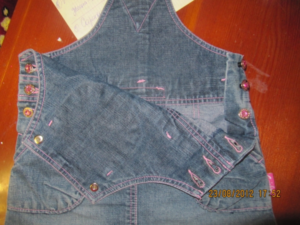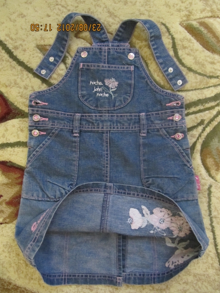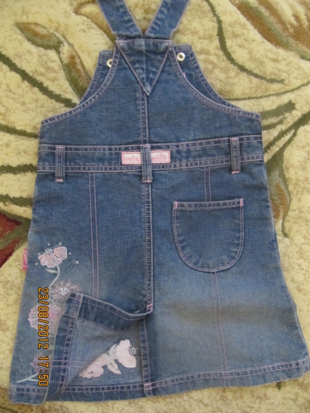 Продам джинсовый сараван в идеальном состоянии!Длина брителек регулируется на кнопках,камушки на пуговицах,бисер-вс ё сохранено!ткань очень хорошо переносит стирки!Длина сарафана-48см ;примерно на 2.5–3.5годика!не пересылаю.цена 65 гр