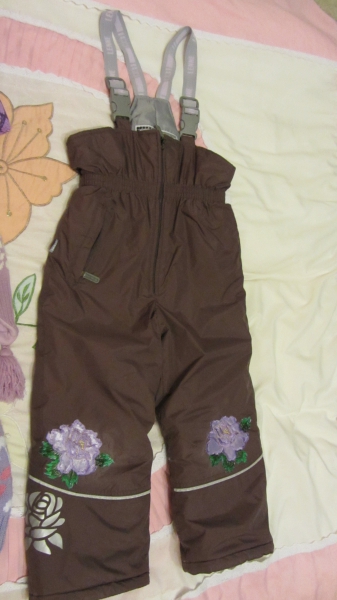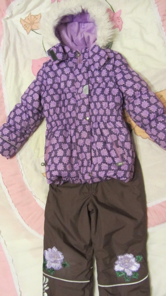 Все в одной цветовой гамме. Куртка в хорошем состоянии, в комбинезоне немного потерты колены, которые спрятаны под накладки в виде цветов. Комплект этой фирмы нас порадовал действительно своей непромокаемостью, мягкостью и удобством!