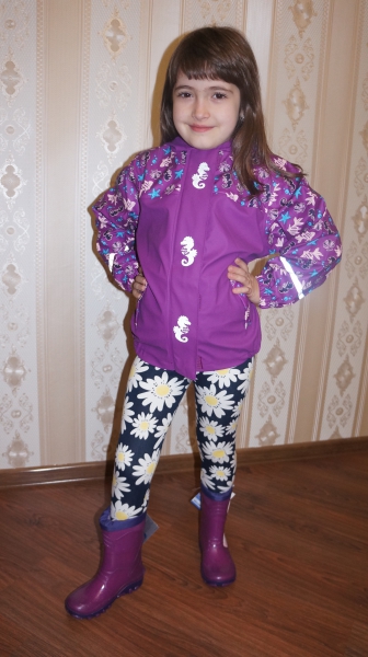 Водо и грязе отталкиквающая прорезиненная ткань, подкладка — флис, на молнии, сверху планочка на липучке от ветра, капюшон. Рисунок содержит светоотражающие элементы.