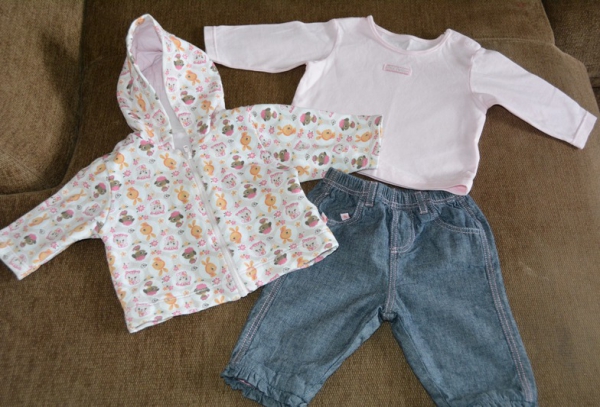Комплект для манюни тройка 0–3 мес: кофточка, курточка, штанишки. По бирке: 100 % хлопок, 0–3 мес., 6,5 кг, размер 59/40. Тепленькое, приятная мягкая ткань. Пару раз одевали только курточку, остальное не носили(даже видно по бирке!). Можно на выписку с роддома, как раз на весну, осень, можно одевать и в прохладное лето. Символически 150 грн.