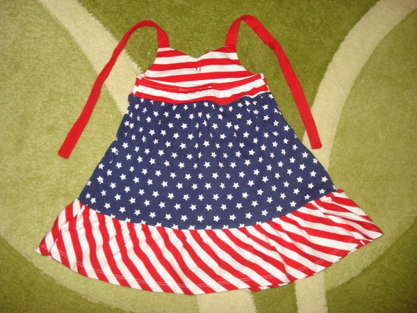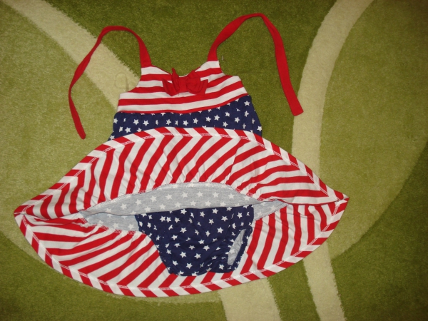 Предлагаем наше платье в стиле американского флага. В комплекте с трусиками под памперс. Не успели не разу одеть, т.к. из из задержек с доставкой попало в Украину в конце сезона, а к началу следующего из него, к сожалению, выросли.