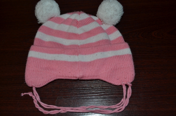 Сама шапочка двухслойная, достаточно плотная с отворотом на ушках и завязочками, которые плотно удержат головной убор на голове у маленькой непоседы.