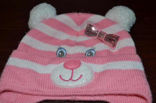 Предлагаем нашу демисезонную шапочку-мордашку . Забавная мордашка котика с двумя бубончиками понравится любой малышке. Рисунки (глазики) — вышивка, мордочка с носиком — нашита сверху. Благодаря этому внешний вид не испортится. Бантик с пайетками прочно приклеен сбоку.