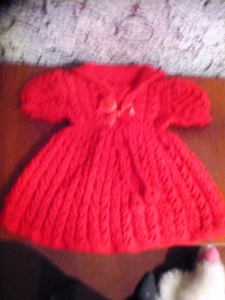 Продам красное платье на девочку. Ручная вязка. К платью прилагаются вязаные носочки. Размер: 86–92. Одевали один раз. Цена: 180 грн.