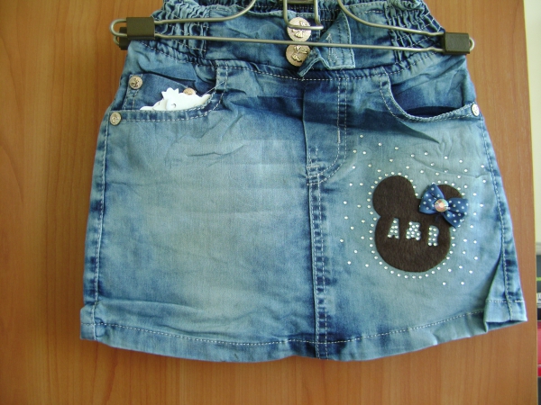 Юбка джинсовая на широкой резинке, спереди застежка — две пуговицы. Ткань немного тянется Производство Китай. Спереди с сзади есть по два кармана
