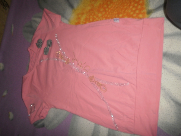 Футболка нарядная, персикового цвета,с декором, производство турция, р 128.Состав 100% хлопок. Длина 52см, ширина по спине 35см. Состояние идеальное.