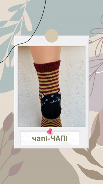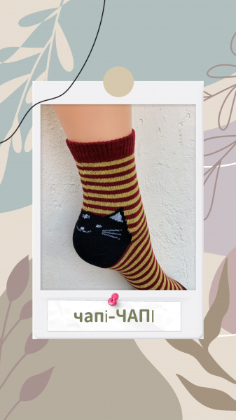 ❤️бордовий з жовтими полосками та котиком на п‘ятці та спереду;