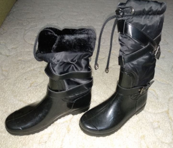 Сапоги резиновые, утепленные искусственным мехом. Стелька вынимается. Верх голенища из плащевой ткани, поэтому сапожки лёгкие. Подойдут как для девоч...