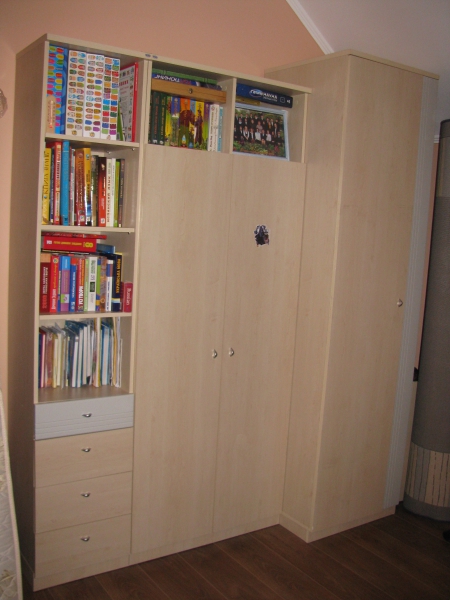 Продам мебель в детскую комнату в прекрасном состоянии, производство «Родные стены»: шкафы (ширина 40 см, 60 см и 80 см), письменный стол угловой (110х110 см), навесная полка, кровать (2мх90 см), матрац Velam (идеально чистый, так как пользовались наматрасником, пятен нет). Прекрасный комплект как для мальчика, так и для девочки. Цена 1900 грн.