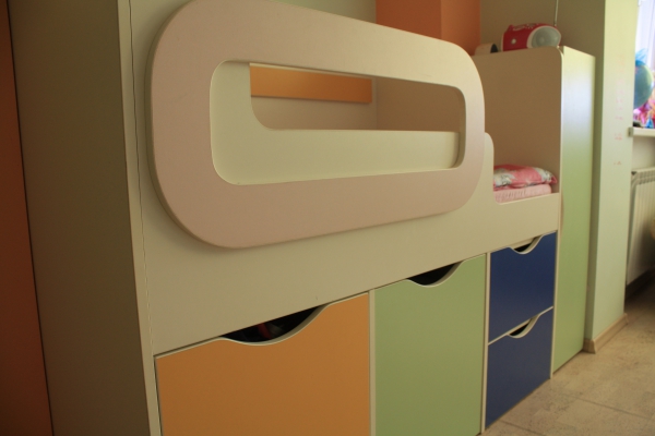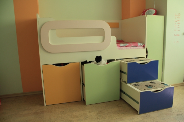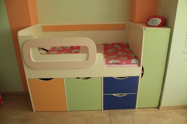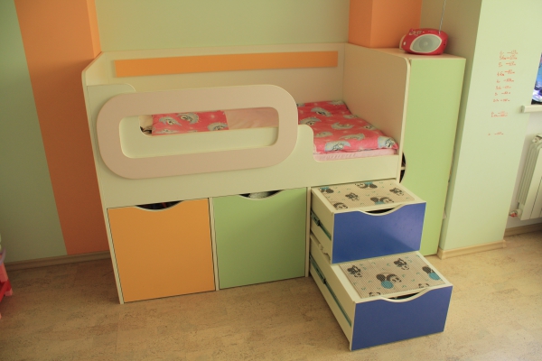 Кровать дизайнерская, уникальная, для детей в возрасте примерно от 2ух до 8ми лет. С выдвижными ступеньками, объемными ящиками и шкафом.