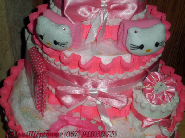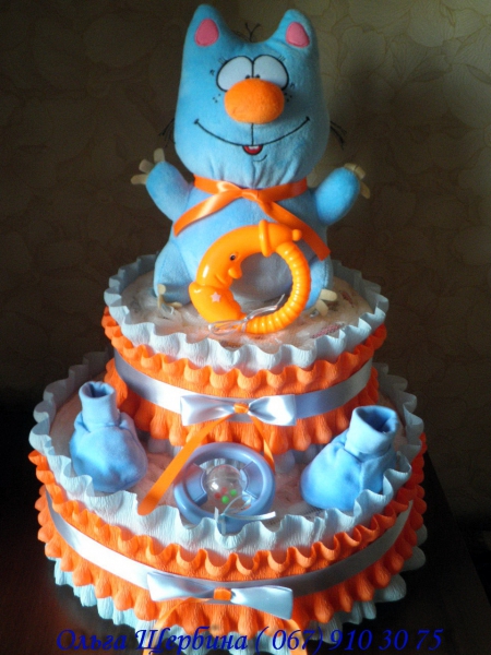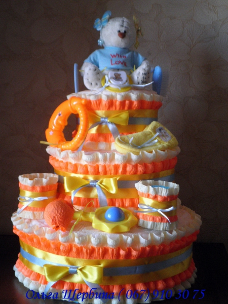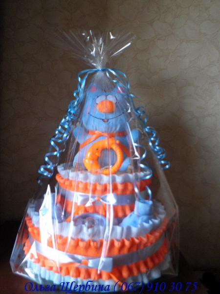 В середину торта и на торт можно разместить множество полезных малышу вещей ( детская косметика, игрушки, сосочки, бутылочки, прорезыватели для зубок, щеточки и расчесочки, пеленочки,одежки, шапочки, носочки и т.п.