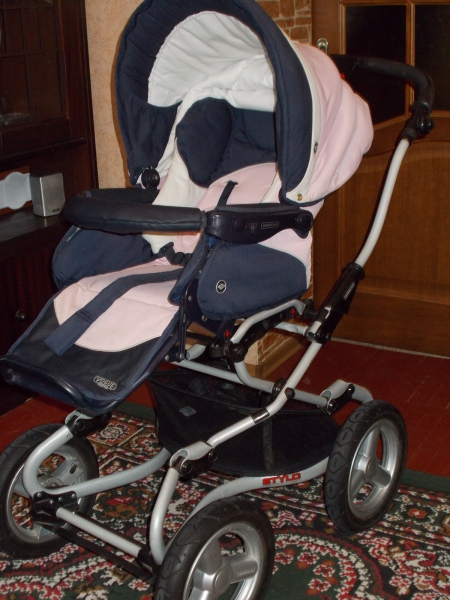 Пневматические колеса на литых дисках наделяют коляску высокой проходимостью, объемная корзина для покупок.