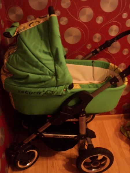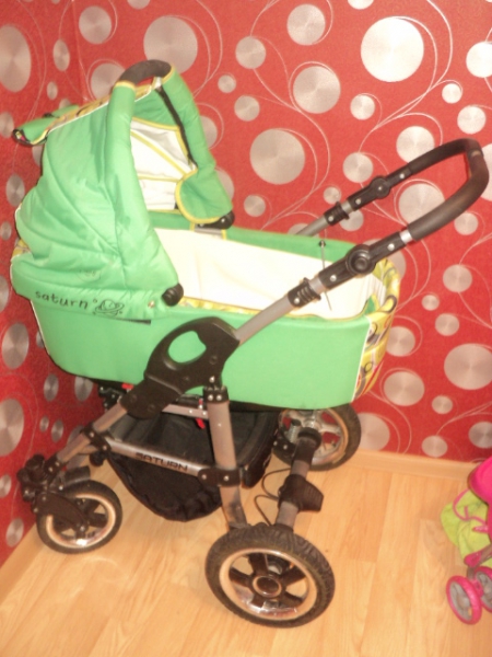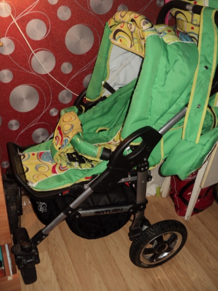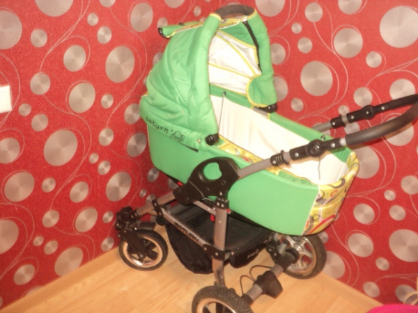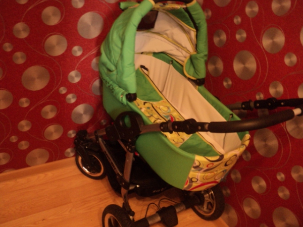 В хорошем состоянии зелено-желтого цвета, к ней идет сумочка для принадлежностей и чехол, внизу корзина!Состоит из двух сьемных частей-люлька и прогулочный вариант!Ручка регулируется!Качество отличное!