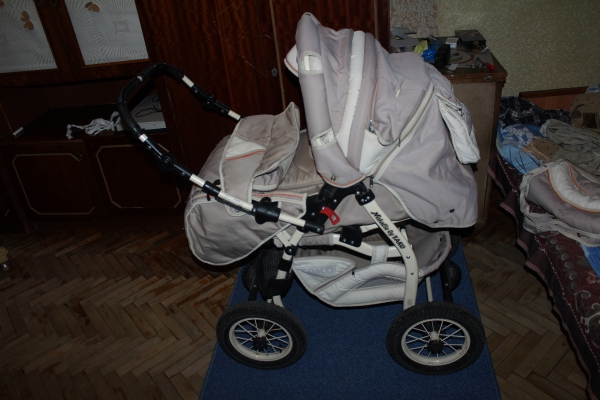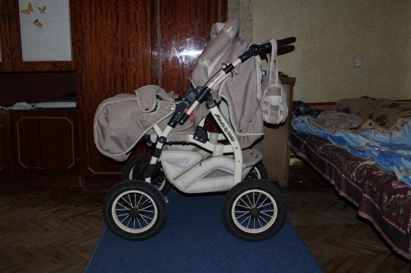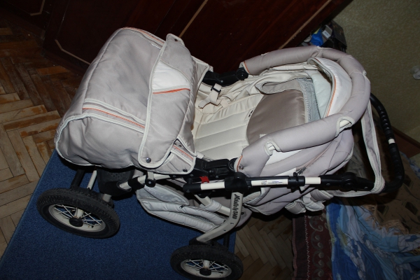 продам коляску ТАКО. Очень надежная и удобная, маневренная, превосходная проходимость по ямам, кочкам бордюрам, ступенькам, замечательная амортизация, ремни безопасности, дождевик, смотровое окошко, сумка для мамы, вместительный багажник, широкое сиденье, утепленная накидка на ножки, съемный бампер, перекидная регулируемая по высоте ручка, надежный ножной тормоз, переноска для малыша, положения спинки от сидячего до полного лежачего, колеса съемные надувные (ни разу проблем с ними не было), на лето все капюшены отстегиваются (на молнии) остается капюшон от солнца, и продуваемая сеточка, цвет унисекс, кремовый.