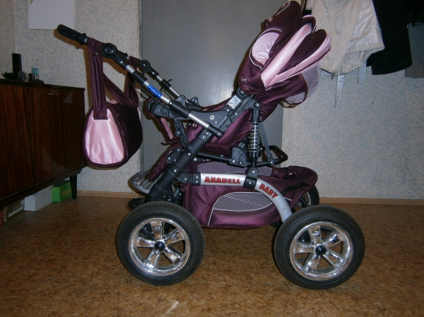 Колеса оснащены пружинными амортизаторами с системой регулирования жесткости амортизации. Благодаря амортизаторам и большим колесам — коляска обладает мягким ходом и повышенной проходимостью по снегу.