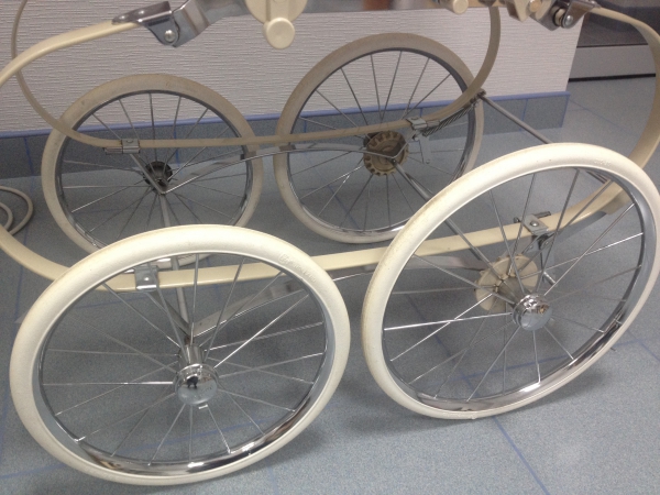 Колеса и корзина для ребенка, выполненная под старину, делают коляску Inglesina Classica похожей на карету.