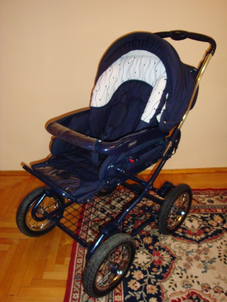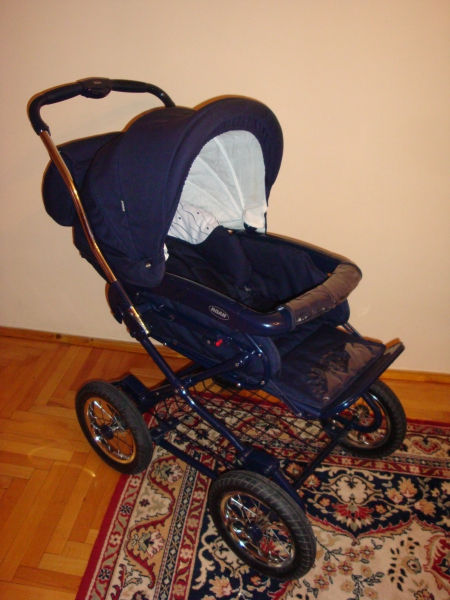 Ручка коляски может устанавливаться лицом по направлению движения и спинкой. Шасси из алюминия легко складывается одним движением руки. От случайного складывания присутствует блокировка. В колясочке хорошее вентилирование. Есть функция качания люльки для убаюкивания.