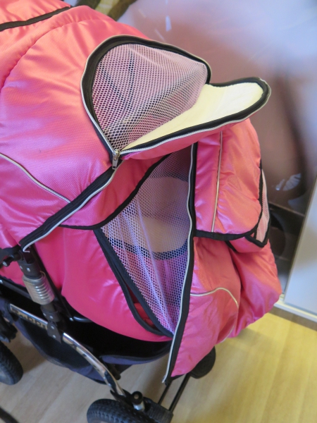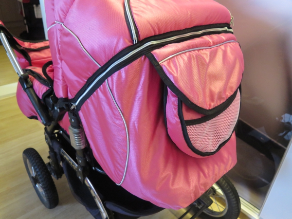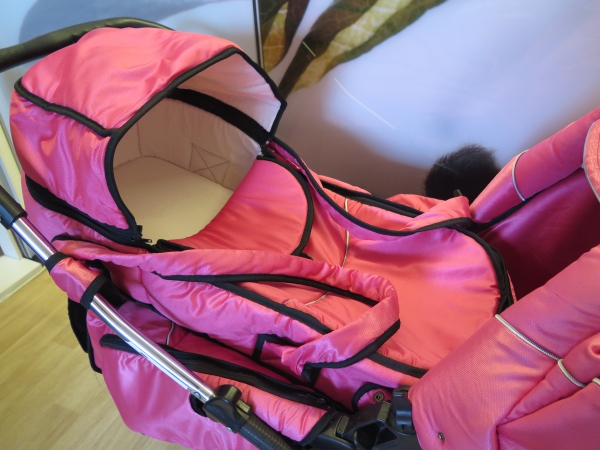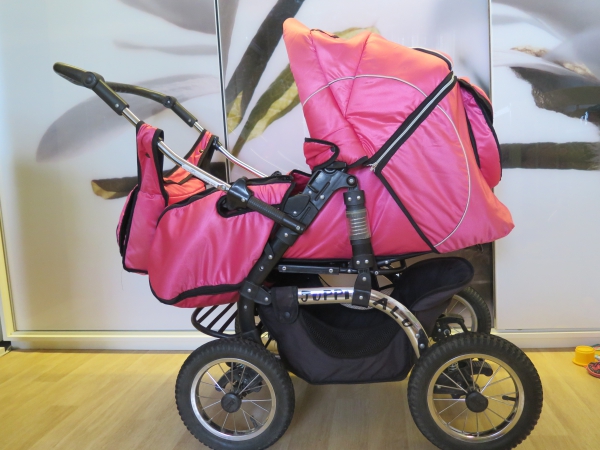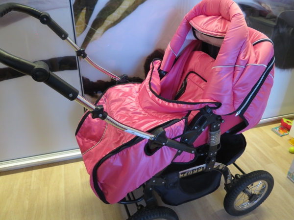 Обшивка коляска сохранила свой первоначальный цвет, всё в рабочем состоянии, легко чистится, полностью снимается с коляски. Обладает хорошей защитой от ветра и непогоды. Зимой малышу очень удобно и комфортно. С обратной стороны капюшон полностью можно отстегнуть в жаркую погоду, имеется и смотровое окошко. Для удобства на капюшоне есть кармашек для хранения мелочёвки. В комплекте к коляске прилагается сумка для мамы, большая вместительная корзина внизу коляски, дождевик, москитная сетка, бампер с подстаканником. Колёса надувные, большие (очень удобно при бездорожье, по снегу), с амортизаторами и тормозами для задних и передних колёс. Ход коляски мягкий и бесшумный. Если нужны дополнительные фотографии коляски могу скинуть.