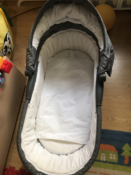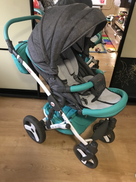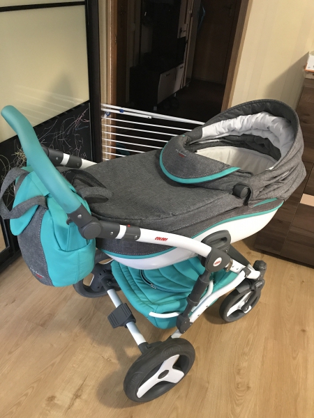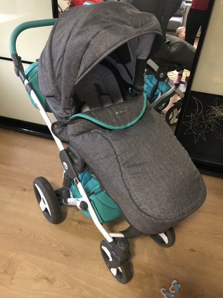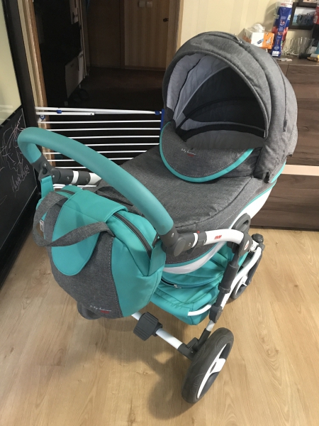 Коляска в отличном состоянии,была куплена новой,после одного ребёнка,в наличии все комплектующие:дождевик,москитная сетка,сумка,матрасик.Снизу в коляске есть ещё одна сумка,колёса достаточно большие,что обеспечивает хорошую проходимость,благодаря вставкам из эко кожи и брезентовому покрытию-коляска отлично моется.На зиму предусмотрен тёплый чехол на ножки,