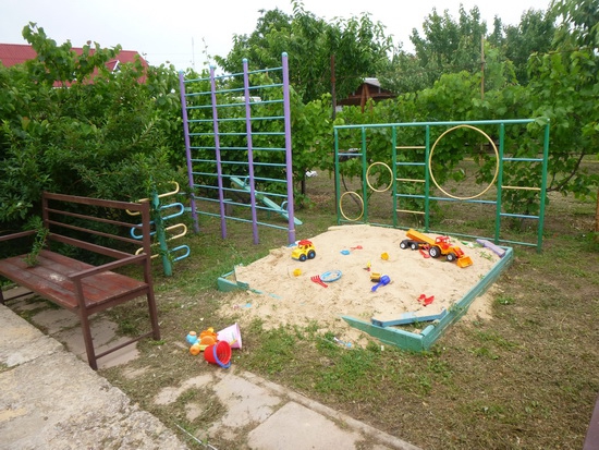 Детям в это время есть чем заняться — песочница, качели, детская площадка рядом с домиками.