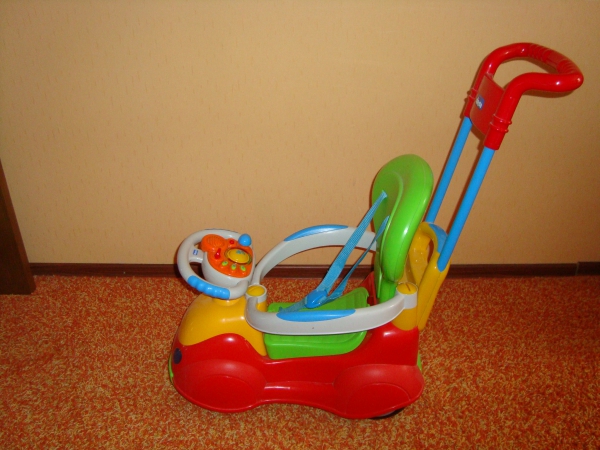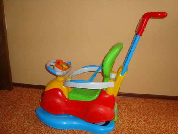 Может быть использован, как качалка, как машина. Ребенок сам может сзади толкать машину или ехать на ней, отталкиваясь ногами.