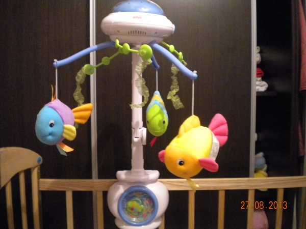 2. Можно добавить к проэктору мелодию: Теперь рыбки и картинки на потолке перемещаются под классическую мелодию. Мелодии переключаются нажатием кнопки с ноткой на куполе мобиля.