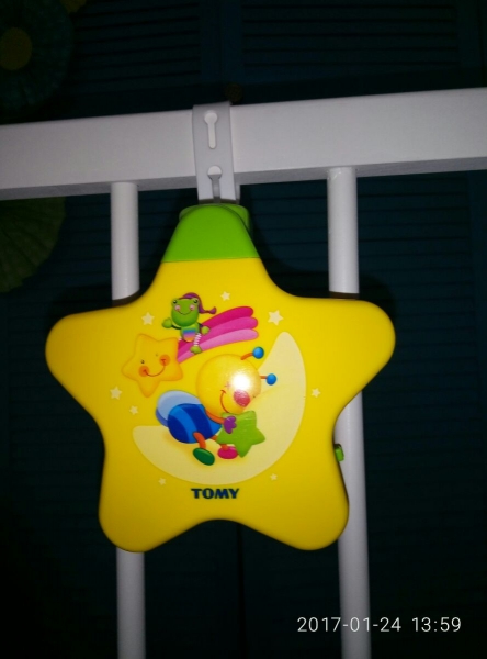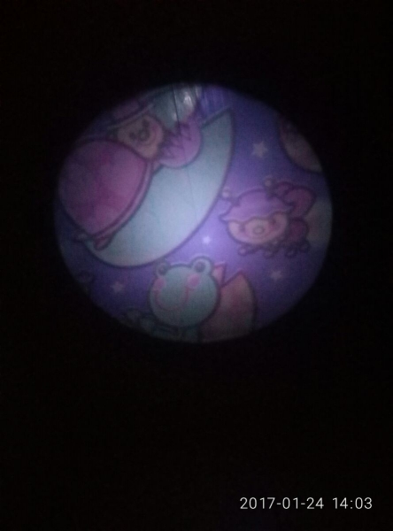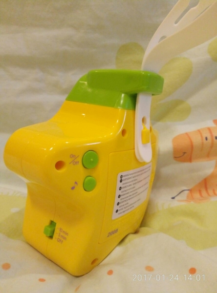 При включении играет приятная мелодия, а на потолок проецируется «сказка», приятная картинка.