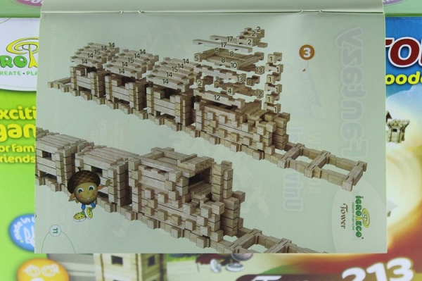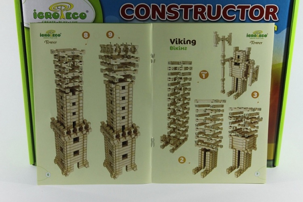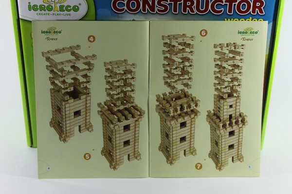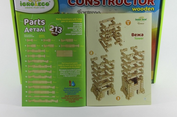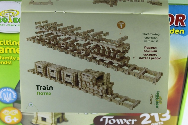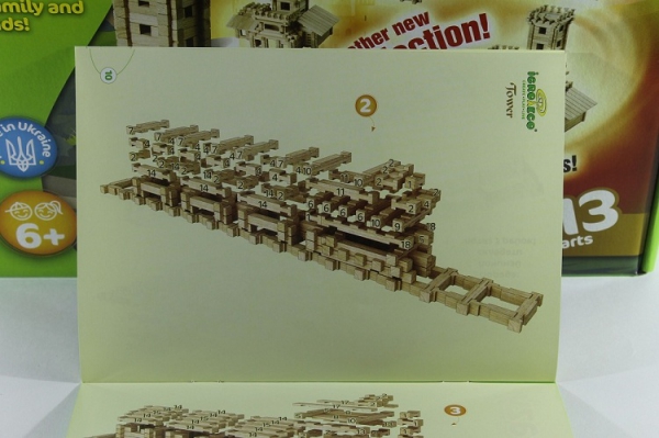 Этот набор от ТМ Игротеко – очень хороший подарок как для мальчика так и для девочки, в возрасте от 3-х лет. Используя в игре такой набор, ваш ребенок сможет своими руками построить башню. Конструктор собирается в несколько этапов, которые очень подробно описаны и проиллюстрированы в пролагающийся инструкции. Между собой детали крепятся методом «паз в паз» без применения гвоздиков и клея, это обеспечивает полную безопасность ребенка по время игры, это также позволяет развивать логическое мышление и проявлять фантазию. Детали конструктора тщательно отшлифованы и ничем не покрыты, они сделаны из натурального экологически чистого дерева — дуба, в следствии чего не возникает аллергических реакций. Количество деталей в конструкторе — 213, размеры упаковки – 34 на 24.5 на 8 сантиметров. Продукция засертификована. Материал коробки – картон, Размер составленной башни – 12 на 11 на 41,5 сантиметров. Это первый из 4-х больших конструкторов серии «Крепость». Из деталей конструктора, кроме самой башни можно сложить на выбор – ПОЕЗД С РЕЛЬСАМИ, ВИКИНГА, или же пофантазировать и придумывать собственные конструкции. Все наборы от ТМ Игротеко — взаємодоповнюються.