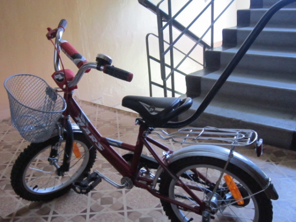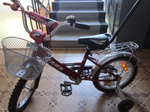 Для детей от 3 лет. Пользовались меньше года. У велосипеда ножные тормоза, обода колес — алюминиевые, покрышки — резиновые, на руле резиновые накладки, есть звонок, ручной тормоз, впереди корзина металлическая, наличие багажника, родительская ручка снимается, сиденье опускается и поднимается, боковые колеса снимаются, но руль к сожалению не меняет своего положения.