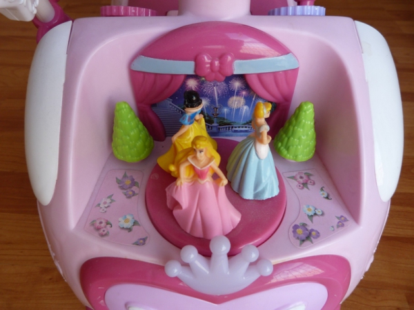 На капоте размещен сказочный замок с фигурками прекрасных принцесс, которые двигаются под звуки приятной музыки.